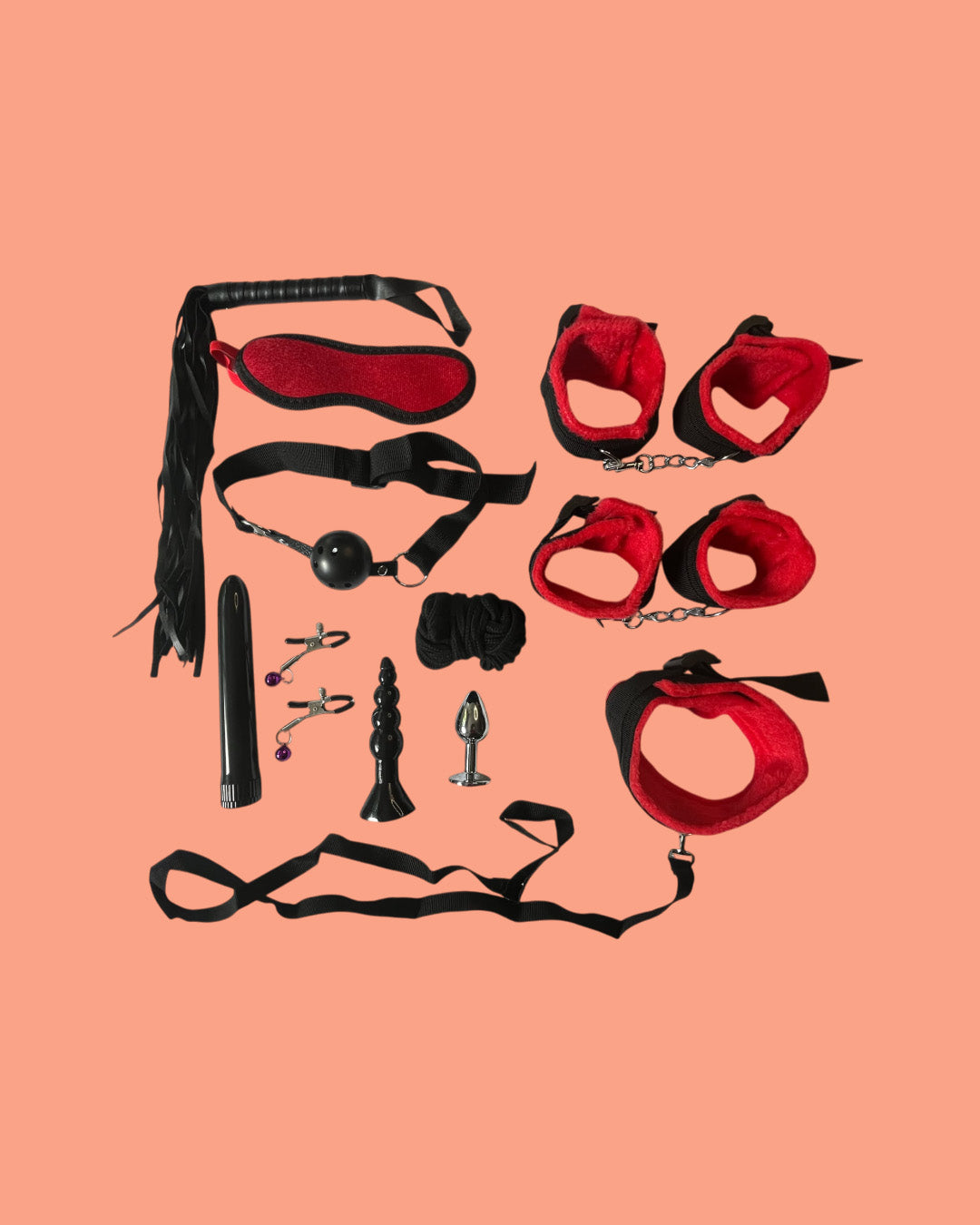 BDSM Set de 11 piezas ROJO Y NEGRO con plug anal y vibrador
